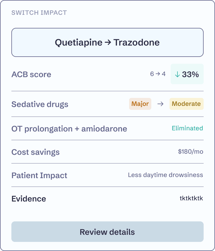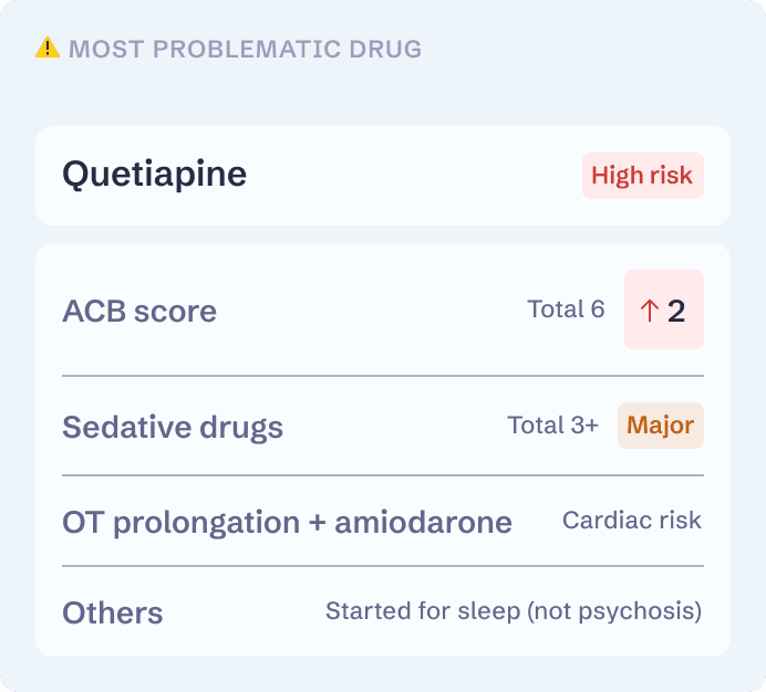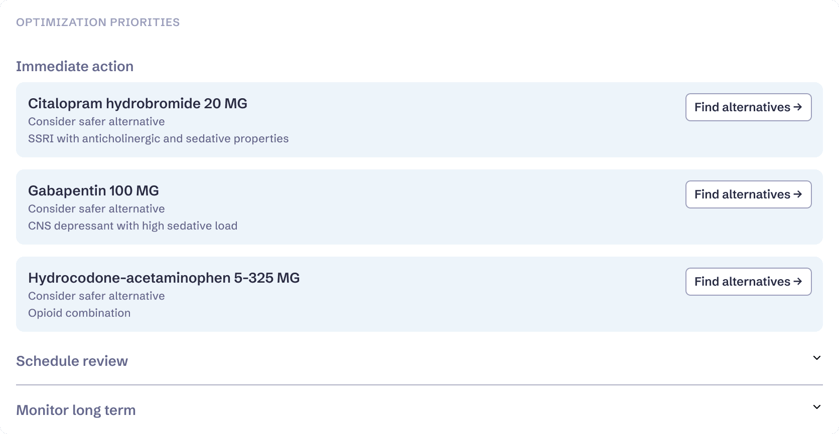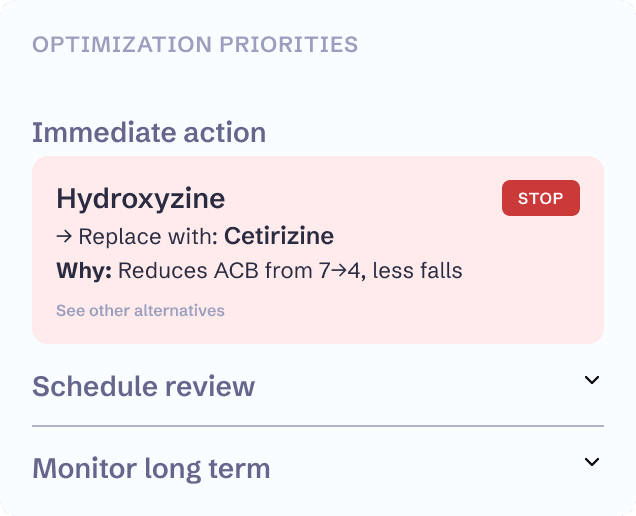 Beyond basic drug interaction checks, our engine delivers deep analysis tailored to real-world senior care. It not only flags prescribing cascade, but recommends phased optimization strategies for safer and smart management.